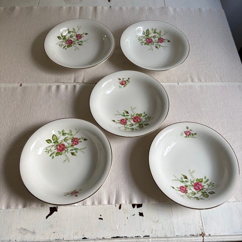 Tre typer av assietter med olika mönster. Fina som blandat porslin till fika eller vardagsdukning. Köpt på second hand.