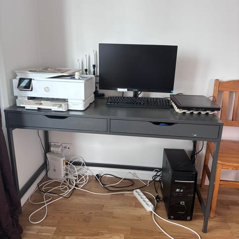 Säljer ett snyggt och stabilt skrivbord i mörk träfinish. Perfekt för hemmakontor eller studier. Bordet har bra arbetsyta samt praktisk förvaring med lådor.