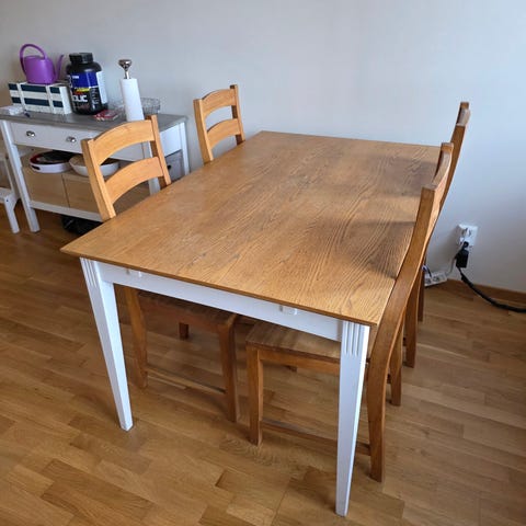 Matbord 140x90 cm, har en del slitage se bilder men kan säkert slipas upp. Bets finns som kan följa med.