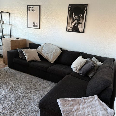 Säljer min 3-sits soffa från IKEA i serien Vimle. Tyget på soffan och puffen är av färgen "gunnared beige". Armstöden är i den snyggare breda modellen.