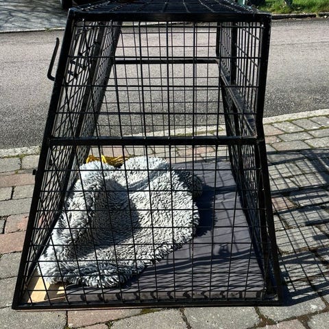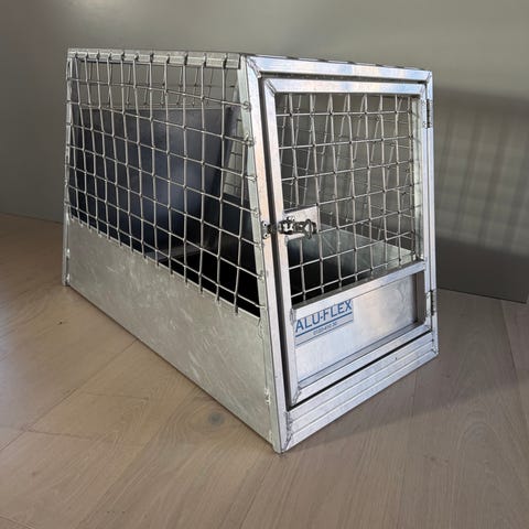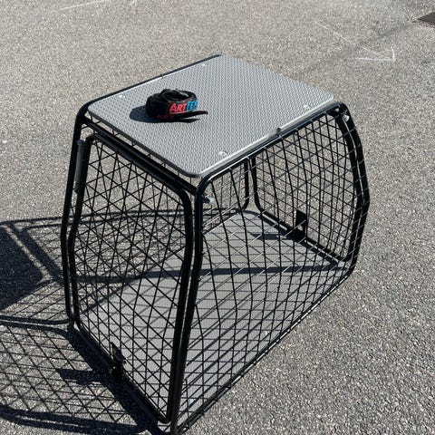 Stadig hundbur i svart metall för bilen med sned bakdel. Har galler runtom, låsbar dörr fram och löstagbar bottenplatta.