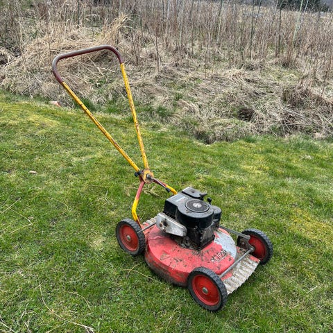 Bensindriven gräsklippare i rött med gul bygel och handtag. Enkel modell med fyra hjul och motor ovanpå klippdäcket.