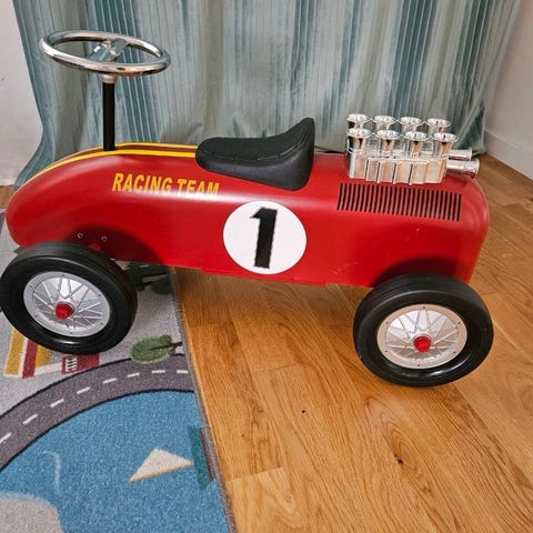 Helt ny i kartong,jättefin gåbil/racing bil att använda både inne och ute.Färgen är gul (som på bilden)Passar barn från ca 1 1/2 år,nypris för denna är 2000kr