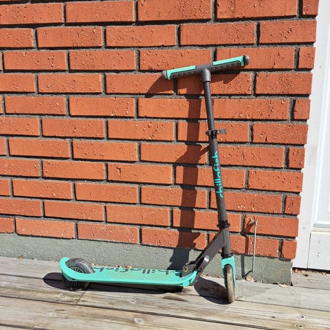 Två hopfällbara Powah sparkcyklar med mellanstora hjul och skumhandtag. Ena har blå detaljer och den andra lila, båda med fotbroms bak och mönstrad ståplatta.