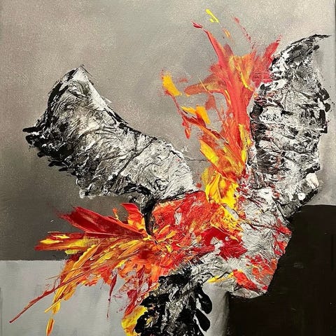 Fina abstrakta tavlor i lugna grå, blå och beige toner, några med inslag av guld. Passar bra att hänga tillsammans på vägg eller var för sig i olika rum.