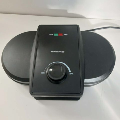 Emerio dubbelt våffeljärn i svart med hjärtformade järnplattor. Utrustad med vred för temperatur och två lampor som visar när det är igång.
