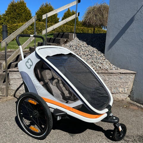 Hamax Outback 2 cykelvagn för två barn i grått och vitt med stor frontlucka i nät. Har stabila hjul, handtag bak och extra framhjul som kan sättas på när man vill använda den som vagn.