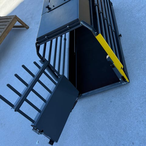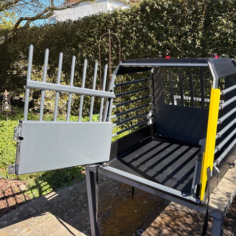 VarioCage single XS hundbur för bil, med galler runtom och rejäl dörr framtill. Stabil konstruktion i metall med gul säkerhetsspärr och justerbar front.