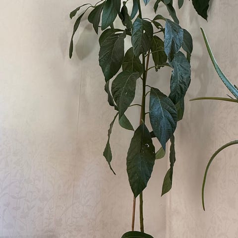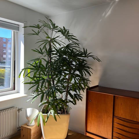 Stor yuccapalm i kruka som står fint inomhus. Planterad i rund terrakottakruka med mörk jord och flera långa gröna blad.ca 1,70 ca hög hämtas på plats