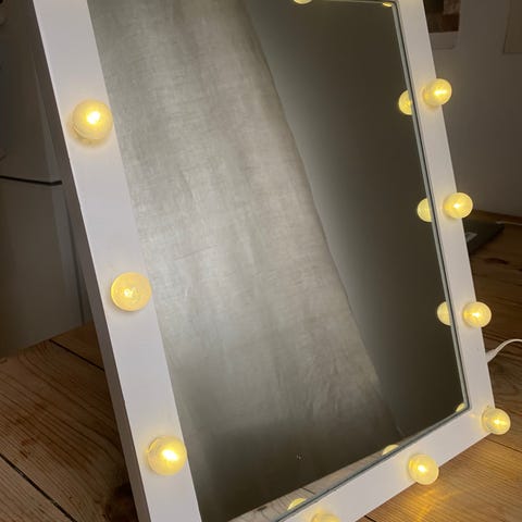 Spegeln med belysning från Clas Ohlson med dimbar LED-belysning. Kan monteras på väggen eller ställas på bordet. Ordinarie reapris 399 kr (reapris)