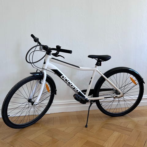 Scott barncykel med 24" hjul i vit färg med svarta detaljer. Utrustad med skärmar, stöd och handbromsar fram, fotbroms bak. Treväxlad.