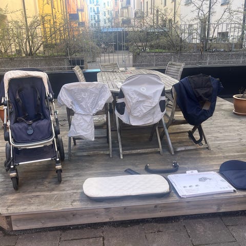 Bugaboo Fox med ligg och sittdel i grått tyg. Vi köpte den begagnad augusti 2024. Vet inte riktigt när den är tillverkad men gissar på 2019 då alla tillbehör är daterade då.