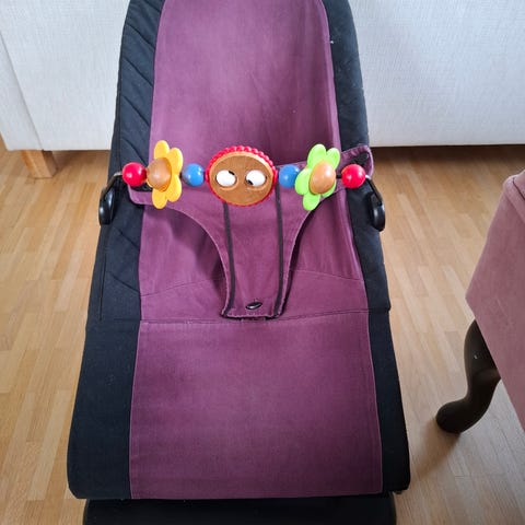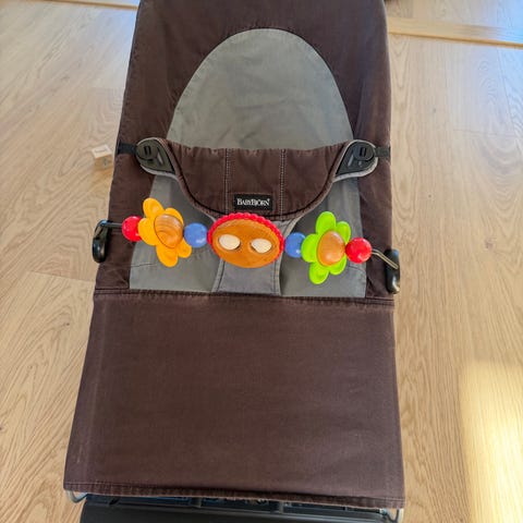 Babybjörn barnstol i grönt tyg. Inkl. lekbåge med färgglada leksaker.