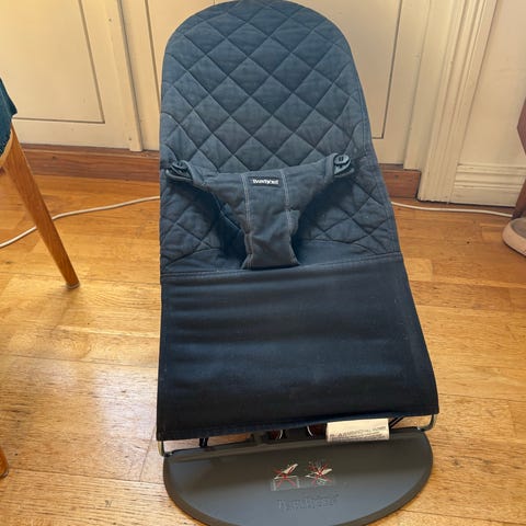 Babysitter från Babybjörn med mörk klädsel och avtagbar leksaksbåge med färgglada figurer. Justerbar lutning och sele framtill.