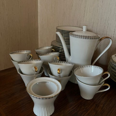 Fina kaffekoppar från Rörstrand med fat, vita med guldfärgade handtag och kant. Säljs som set med matchande liten burk med lock och guldfärgade handtag.