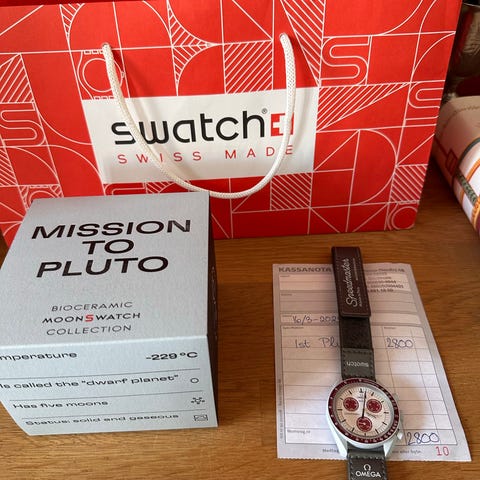 Swatch MoonSwatch Mission to Pluto armbandsur i unisexmodell med svart band och röd/vit urtavla. Levereras i originalförpackning med kartong som syns på bilden. Provad men har legat i sin kartong mest hela tiden. Inköpt i Köpenhamn. Kvitto finns.