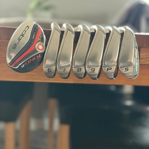 Cobra King JR golfset 13-15 år med flera järnklubbor, driver, hybrid och putter samt matchande headcovers. Lätt bärbag men ena benet är sönder. Flera fickor för bollar och annat smått.
