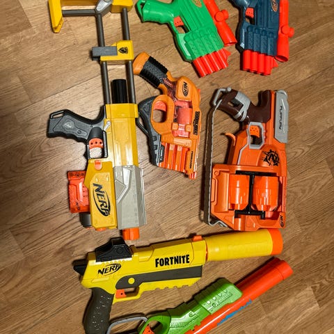 Flera Nerf-blasters i olika modeller, bland annat Fortnite och Mega i gult, orange, rött och lila. Fina leksaksvapen för skumdart med både mindre pistoler och större gevär i mixad stil.