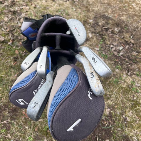 Junior golfbag med benstativ och axelrem samt flera fack för förvaring. Flera olika klubbor ingår i bagen.