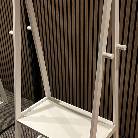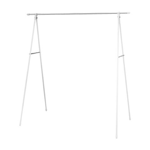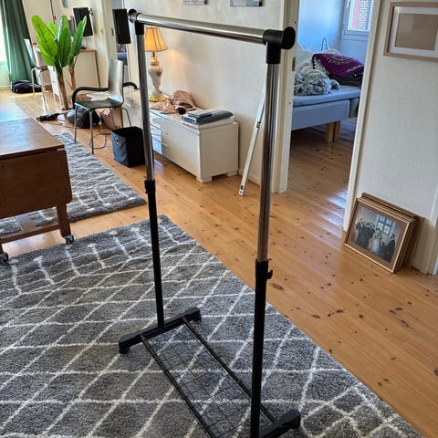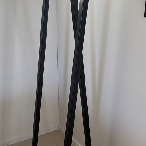 Klädställning/klädhängare från Mio i svart med stång upptill och hylla med ribbor nedtill. Perfekt att hänga jackor på och ställa skor eller lådor under.