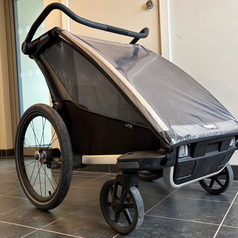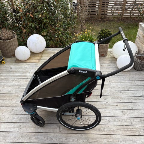 Vagn från Thule med plats för 2 barn som också kan användas som cykel- och joggingvagn och skidpulka. Cab modellen har väldigt rymligt bagageutrymme som är perfekt vid utflykter. Vagnen är i gott skick och har förvarats inomhus. Cykelkoppling, regnskydd, solskydd, cykellyse och flagga medföljer.