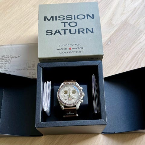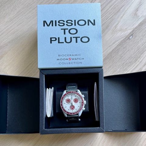 Swatch x Omega Mission on Earth armbandsur i unisexmodell med mörk boett och kronograf. Levereras i originalask med grönt lock där modellnamnet står. Provad men har mest legat i sin ask. Kvitto finns. Köpt i Köpenhamn.