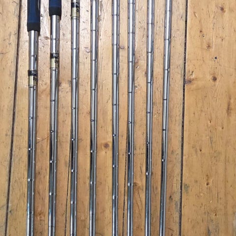 Mizuno MX-25 järnset med flera järnklubbor i samma serie. Svarta grepp och blanka klubbhuvuden. Pitch-järn 4
