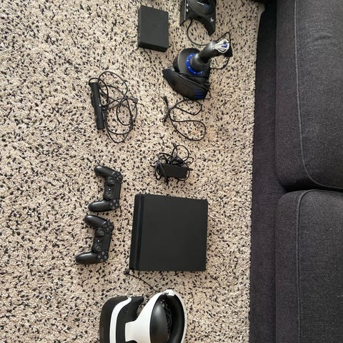 Säljer mitt PlayStation 4 med VR-headset, två handkontroller och ett stort spelpaket inklusive flera populära VR-spel.