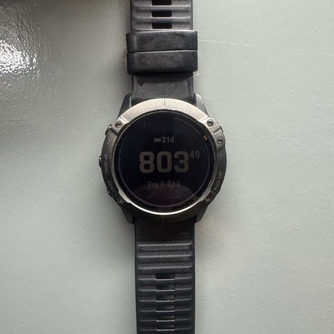 Garmin Fenix 8 smartklocka med orange silikonarmband. Rund boett i metall med flera knappar på sidorna och klassiskt spänne. Laddkabel finns skickas ej