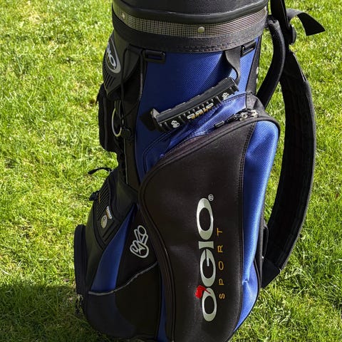 Ogio golfbag, svart med gröna detaljer. Flera ytterfack med dragkedjor och axelrem för att bära väskan lättare. Blixtlåset till översta lilla fickan trasig.