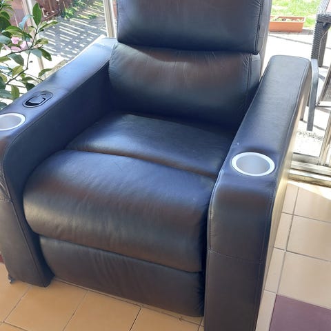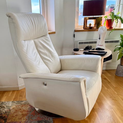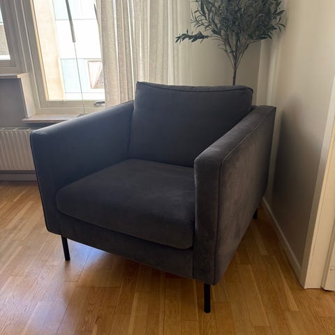 Grå reclinerfåtölj från Mio med mjuk klädsel. Fälls ut med spak på sidan så du kan sträcka ut benen ordentligt.