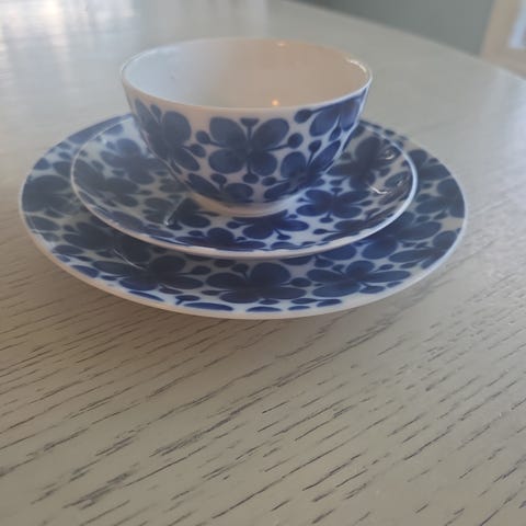 Rörstrand Mon Amie tallrikar och skålar i blåvitt blommönster säljes som set. Fina djupa skålar och stora tallrikar med samma dekor runt kanten.