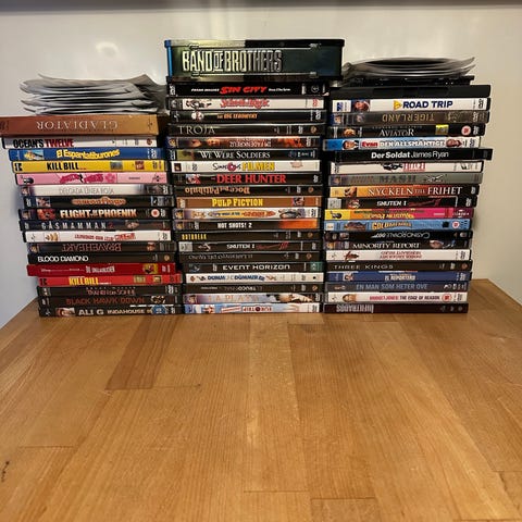 Paket med blandade DVD-filmer, bland annat Shrek, Narnia, Star Wars och Rocky Balboa. Fodral med tryckta omslag, flera olika genrer och titlar i samma bunt.