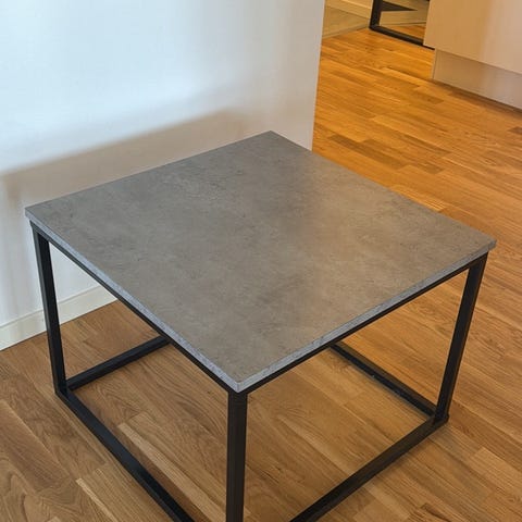 Betongbord med svart underrede i stål. Inköpt på Mio.