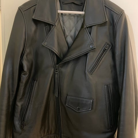 Svart skinnjacka från Deadwood i stl 46 känns som m/l. Dragkedja framtill, tryckknappar vid kragen och flera fickor fram.