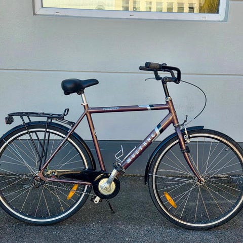 Gul Raleigh stadscykel för man med 28" hjul och ramstorlek M. Har pakethållare bak, kedjeskydd och fotbroms.