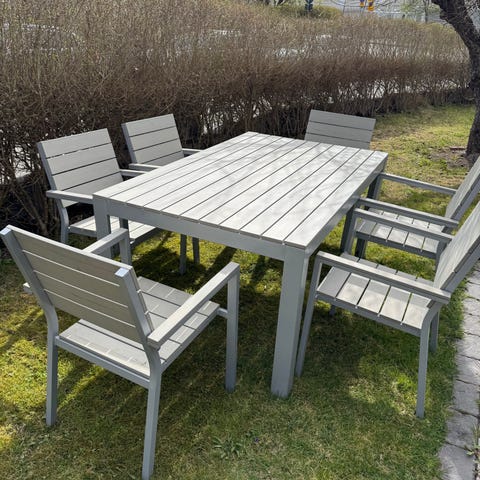 Grönt trädgårdsset från Hartman med plastbord och stolar med armstöd. Randiga gröna och vita dynor på stolarna och bord i matchande färg. Stolarna är som nya men bordsskivan är solblekt. Allt är helt, inga skador på plasten.