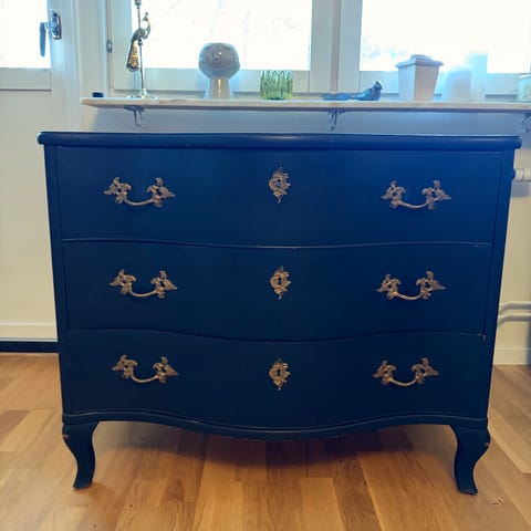 Byrå i rokokostil med svängda sidor och tre lådor med dekorativa mässingshandtag. Målad i grå/blå färg. Kommer med tillhörande marmorskiva.