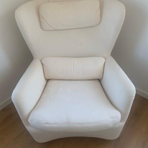 Någon limmad spricka men inget som påverkar funktion, liten reva i framkant på dyna. Nackkudde missfärgning