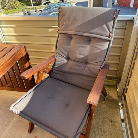 Trädgårdsstolar (Ikea Nämmarö) i mörkt trä med ribbad sits och rygg, går att fälla ihop. Gråa sittdynor med snören för att knyta fast följer formen på stolarna.