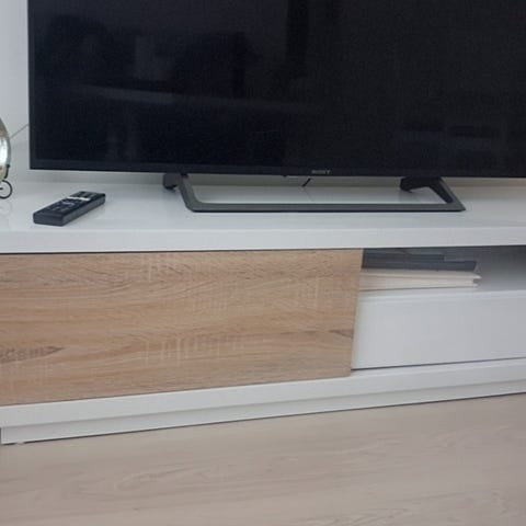 Vit TV-bänk med träfärgade luckor och öppna hyllor för förvaring av mediaenheter. LED-belysning som styrs med fjärrkontroll följer med för att kunna ändra färger under bänken.