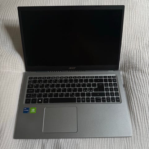 Acer laptop i silver med tunn design och fullstor tangentbordslayout. Har flera portar på sidorna för anslutningar och en mörk foderväska syns på bilden.