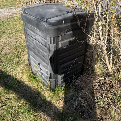 Grön kompostbehållare (Milko) i plast med lock och ventilationshål. Har löstagbar bottenplatta och öppning framtill för att komma åt komposten.