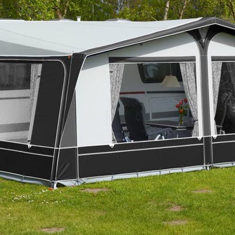 Isabella Annex 250 till förtält, i grått tyg med stort fönster på sidan. Har dörr fram och fästs mot befintligt förtält till husvagn.