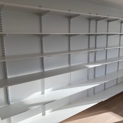 Elfa vägghängt hyllsystem med vita hyllplan och skåp nertill.