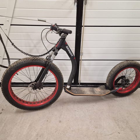 En Kickebicke scooters crossfix (finsk) som har använts för träning av drag- och jakthundar. Antenn och draglina ingår.