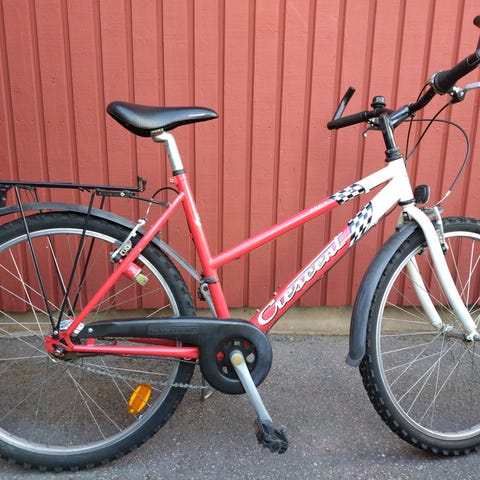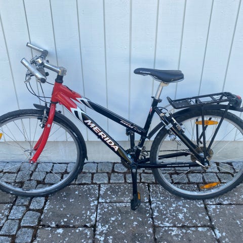 Fina däck med djupa spår. Utrustad med pakethållare bak, stöd och reflexer på hjulen.