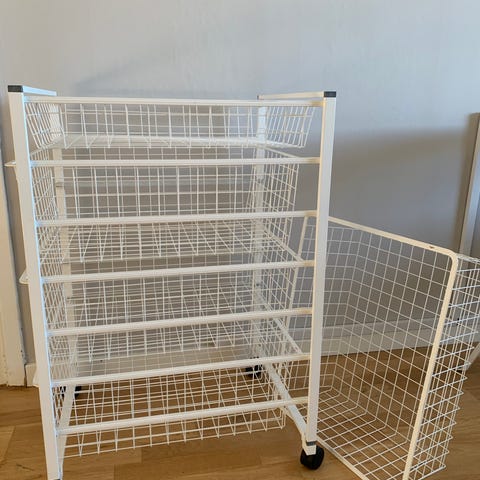 Elfa hyllsystem ca 2 meter i två sektioner och 9 trådbackar. Paketpris 800kr. Skohylla (separat bild) kan fås med på köpet. Vid intresse finns ett till liknande hyllsystem, ställning och trådbackar till motsvarande pris. Har även skenor och konsoller för uppsättning.