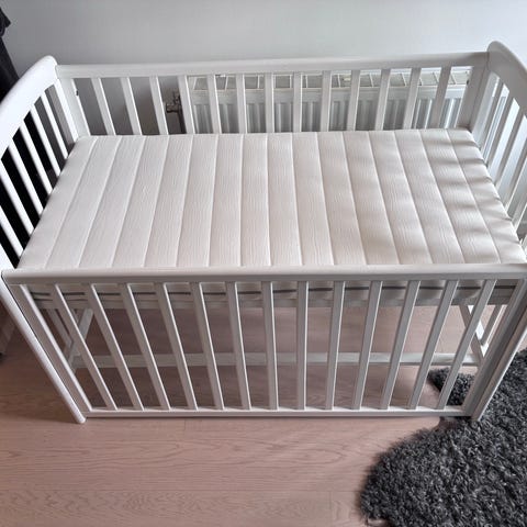 Vit spjälsäng från JLY med praktisk utdragslåda under med tillhörande madrass (märke Babymatex) med quiltat överdrag och dragkedja.