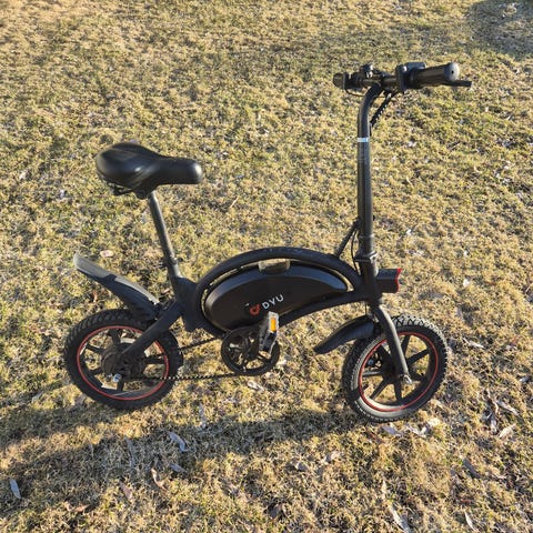 Säljer en svart hopfällbar elcykel med robust ram, breda däck och digital display på styret. Cykeln har bekvämt sadel, handbroms och batteri integrerat i ramen.